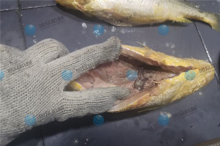 1斤多的黃魚想要開肚去鱗自然得選擇XZ-018開肚去鱗殺魚機,該殺魚機加工魚常規(guī)款是2-8斤,而1斤多的黃魚則需要0.8-2斤的規(guī)格的殺魚機器,黃魚比較扁會稍微開偏一點,魚鱗是去的相當(dāng)?shù)母蓛簦蛻艨戳硕颊f這殺魚效率真快,因為他們是專門加工這種黃魚的,每天都要殺好幾百斤,人工每天都做不過來,便想著購買全自殺魚機代替人工開肚去鱗殺魚等工序,于是在網(wǎng)上便找到了旭眾全自動殺魚機,撥打4008852117咨詢客服了解基本情況后,帶著黃魚來到現(xiàn)場直觀殺魚機殺黃魚的效果: