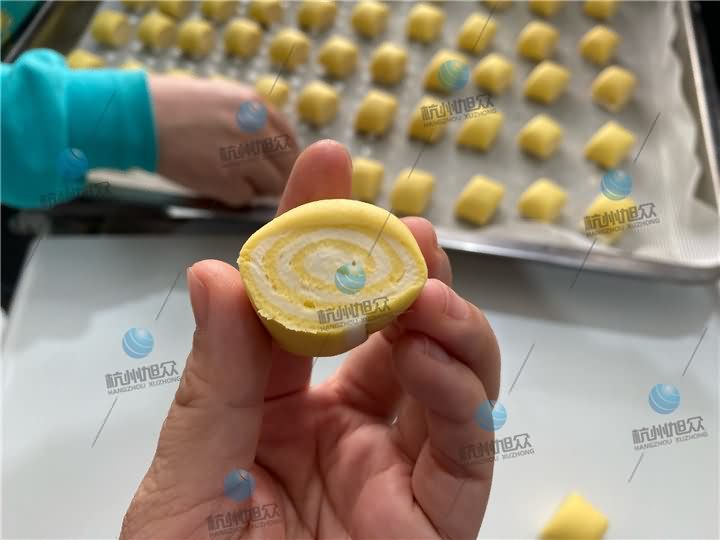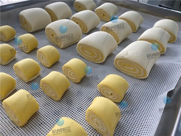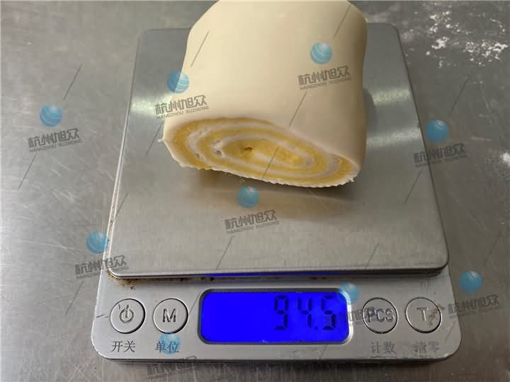 3、再通過MP800A刀切饅頭機壓面、卷面、刀切成一個個雙色雜糧方饅頭