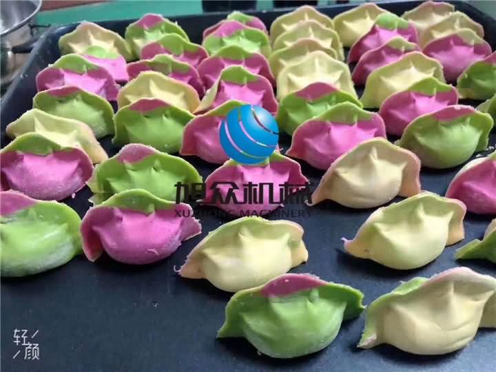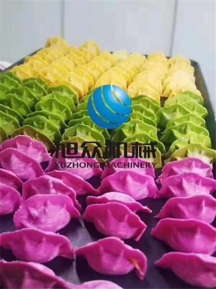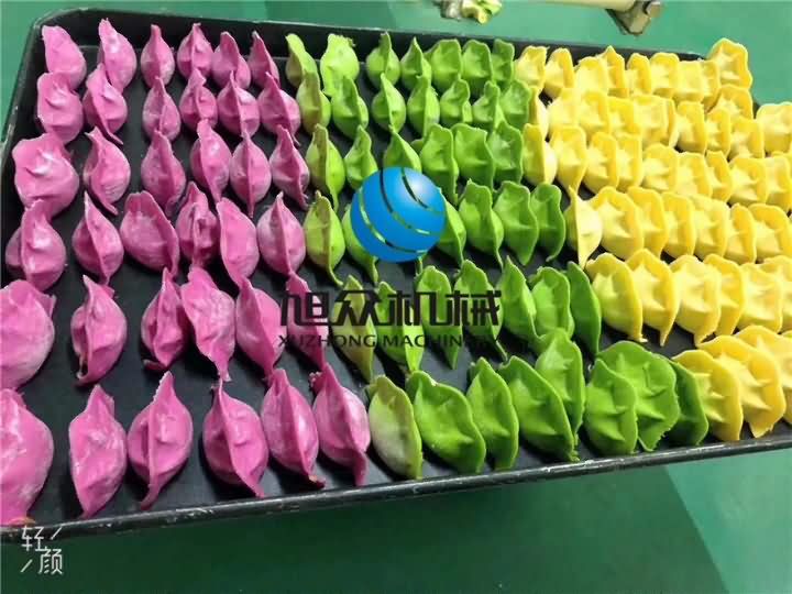 今日J(rèn)GB-210仿手工餃子機(jī)做三福餃子咯!用火龍果、菠菜、南瓜分別榨成汁再和面粉攪拌成不同顏色的面團(tuán),攪拌好的面團(tuán)再通過壓面機(jī)反復(fù)壓成面皮后,最后通過餃子機(jī)自動包餡成型一個個果蔬水餃: