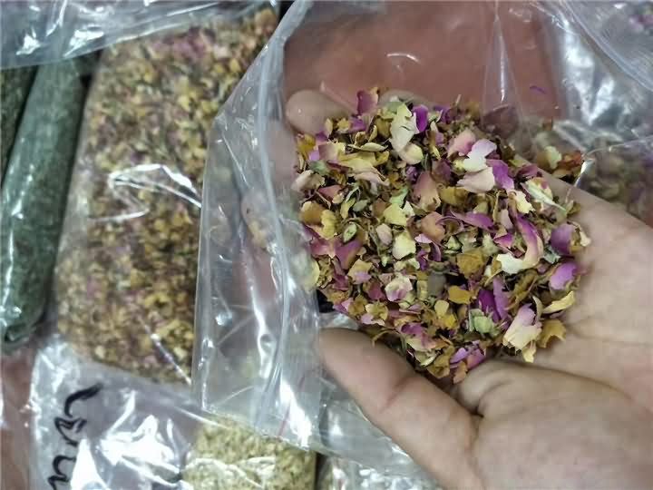 旭眾不銹鋼破碎機破碎篩網孔徑標配6mm或者8mm,另可定制10/12/14/16/18/20/30,一般不定制小于6mm的孔徑,遠在新疆的劉老板寄了他家烘干好的玫瑰花等物料來到現場,并直觀了用破碎機破碎后的效果: