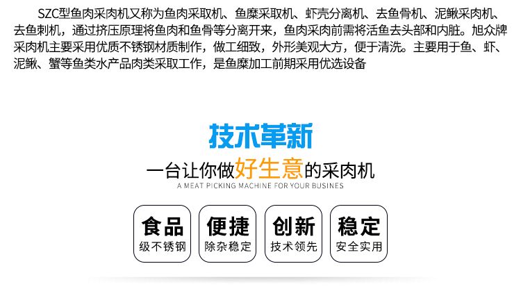 旭眾XZC系類魚肉采肉機是一款專業加工魚肉去刺、蟹蝦去殼的機械,由于隨著市場的發展,人們生活中漸漸離不開有魚的生活,無論是家里、飯店等魚都是主要的食物還有現在一些休閑食品中都是離不開魚加工后的魚泥。魚肉采肉機的研制成功給人們生活中帶來很多方便,無論是您做魚丸、魚餡等只需要一款魚肉采肉機就可以實現,對于大量生產即降低了人工成本,又提高了生產效率。